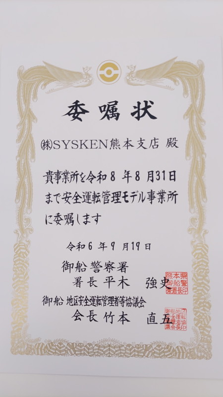 【熊本支店】「安全運転管理モデル事業所」に指定されました 2024.09.19 カテゴリー: SYSKEN NOW! SYSKEN熊本支店は、令和6年秋の全国交通安全運動御船警察署管内4町合同出発式において、 益城町の「安全運転管理モデル事業所」の委嘱交付を受けました。 期間は2026年8月31日までの2年間です。 交通安全の推進に向け、気持ちを新たに取り組みます。