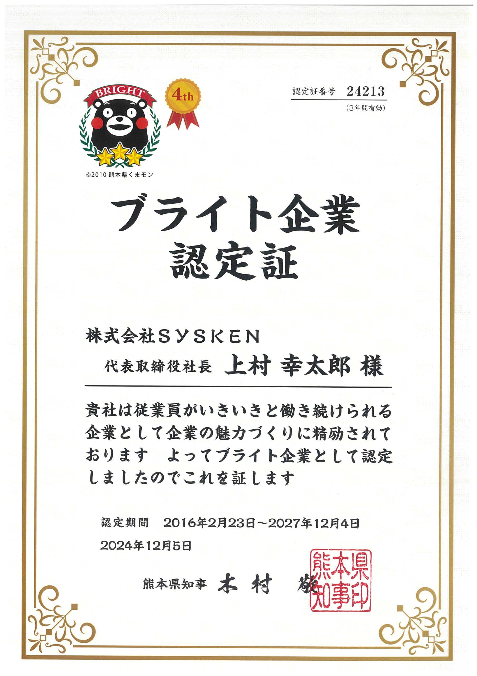 熊本県ブライト企業に認定されました。 SYSKENは4回目の認定で、認定期間は2027年12月4日までとなります。 ■ブライト企業とは?(熊本県HPより) 働く人がいきいきと輝き、安心して働き続けられる企業を「ブライト企業」(ブラック企業と対極の企業をイメージした熊本県の造語)として認定しています。 ブライト企業の優れた取組みを広く周知することにより、県全体の労働環境や処遇の向上を図るとともに、若者の県内就職を促進します。 <認定基準> 01.従業員とその家族の満足度が高い 02.地域の雇用を大切にしている 03.地域社会・地域経済への貢献度が高い 04.安定した経営を行っている 10の応募要件に加え、上記の4要件に関連した審査項目について審査を行い、 一定基準を満たした企業のみ「ブライト企業」に認定されます。![]()