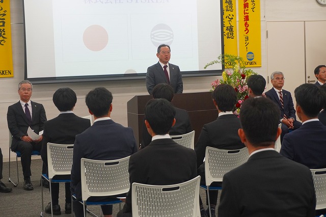 【本社】令和7年度入社式 2025.04.01 カテゴリー: SYSKEN NOW! SYSKEN本社ビル1階大会議室において、令和7年度入社式を執り行いました。 本年は学卒15名、社内任用5名がSYSKENの新たな仲間として入社し、 新入社員代表より 「今日のこの初心を忘れることなく株式会社SYSKENの一員としての自覚と プライドを胸に、会社の発展のために全力を尽くします」との決意表明がありました。 これからSYSKENの一員として、共に頑張っていきます。